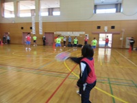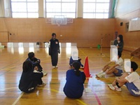 この交流会には、三尻中、大麻生中、大原中、玉井中が参加しており、総勢14名でドッチビーを楽しみました。最初は緊張していた様子の子供たちですが、自己紹介をしたり、ドッチビーで一緒に戦ったりする中で、だんだん打ち解け合えたようです。玉井中は、終わりの会の司会や閉会の言葉、感想発表も行いました。帰るときには「気をつけて!」とか「また来てくださいね」などと、周りの生徒から声をかけてもらっていました。