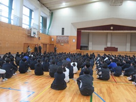 今日で、後期前半が終了となります。どの学年も、授業や行事、部活動等に一生懸命取り組み、大きなけがや事故なく終わることができました。校長からは、冬休みをどのように過ごしたら年明け良いスタートがきれるのか、よく考えるようにという話がありました。また、生徒指導主任と養護教諭からは、冬季休業中に気をつけることについて、それぞれ話がありました。その後、学年ごとに集会を開き、後期前半の授業を終えました。