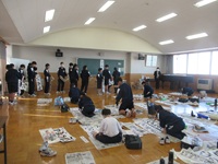 外部指導者の依田先生においでいただき、一年生の書きぞめのご指導をしていただきました。生徒たちは、書き終えた作品をもって、先生の前に並び添削をしていただきました。「上手に書けているよ」とほめながら丸をつけてもらい、生徒たちはとてもうれしそうでした。