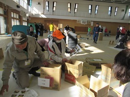 2月15日(日)玉井地区の防災訓練が、玉井小学校体育館にて実施されました。まず黄色いタオルを自宅にかける安否確認から始まり、小学校体育館での段ボールを利用した椅子や簡易トイレづくり、心肺蘇生法の実施訓練、炊き出し訓練(カレー)が行われました。